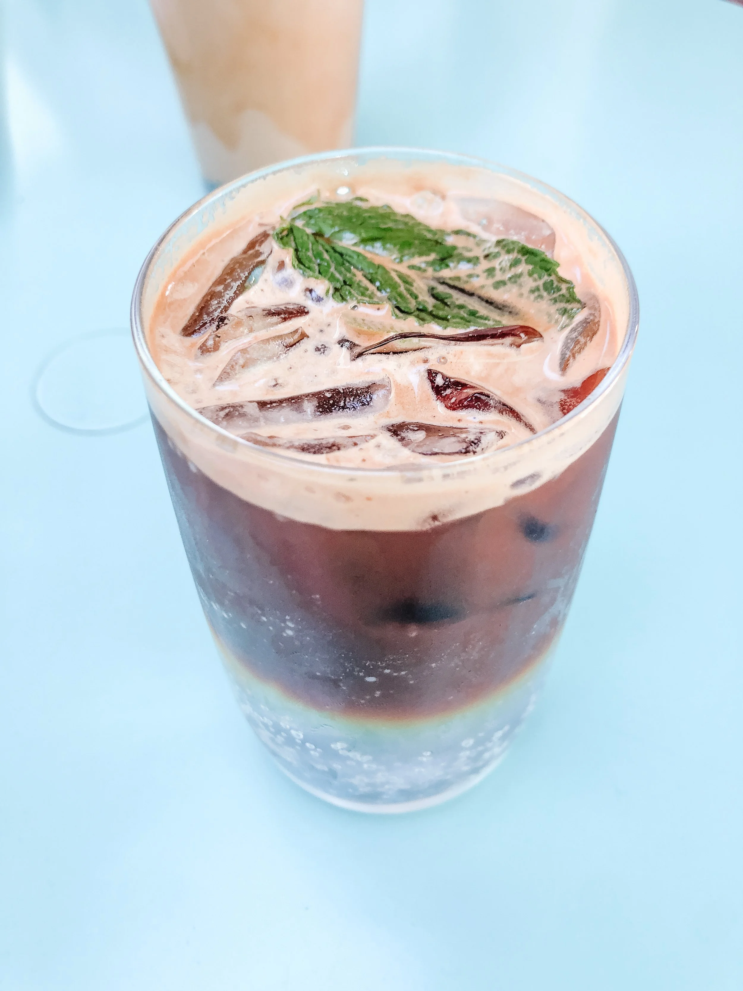 Slowly top tonic with the double espresso (or single of you prefer!), rub the rim of the glass with the zest of an orange and sprinkle the top with a dash of cardamom. Garnish with a mint leaf and a straw for sipping.