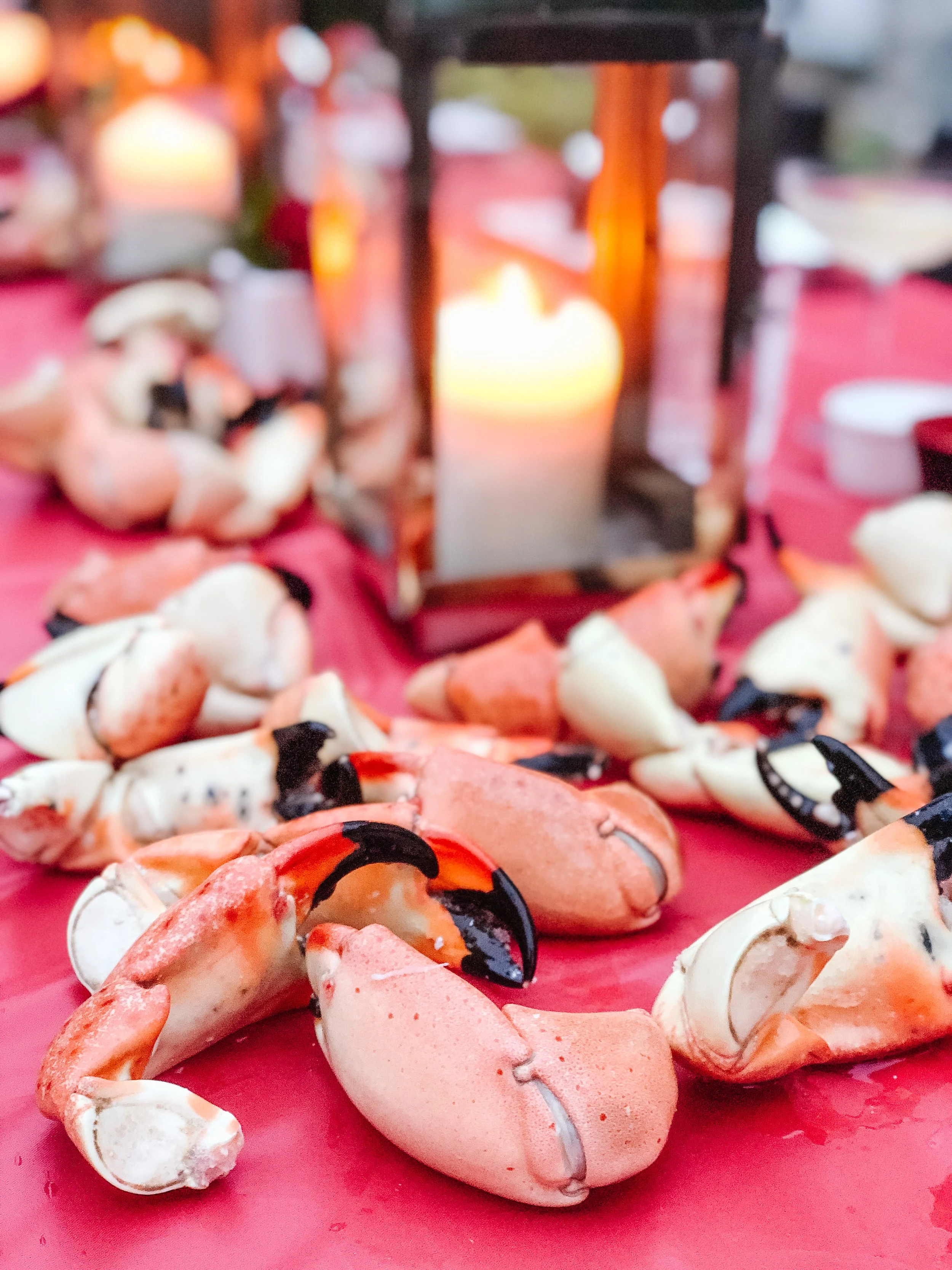 Everything about my birthday dinner was fun! My daughter shares my passion for food and loves to set the scene for a themed meal. She showcased the amazing seafood my husband had delivered (more on that next) with the perfect stone crab table setting. Cute little wooden crab mallets and crab bibs topped each plate along with a mini party hat. The table was covered with a red disposable table cloth(important for clean up as we scattered the stone crab claws ALL OVER the table!) and little bowls were set out for melted key lime butter, and dipping sauces. It was perfection!